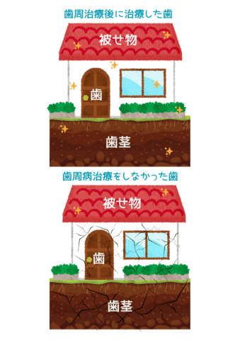 仮に素晴らしい被せ物を入れたとしても、歯周病によって歯茎や骨に細菌の感染があれば、緩んだ土地にグラグラの柱を立てて、その上に立派な屋根だけを乗せることと同じです。